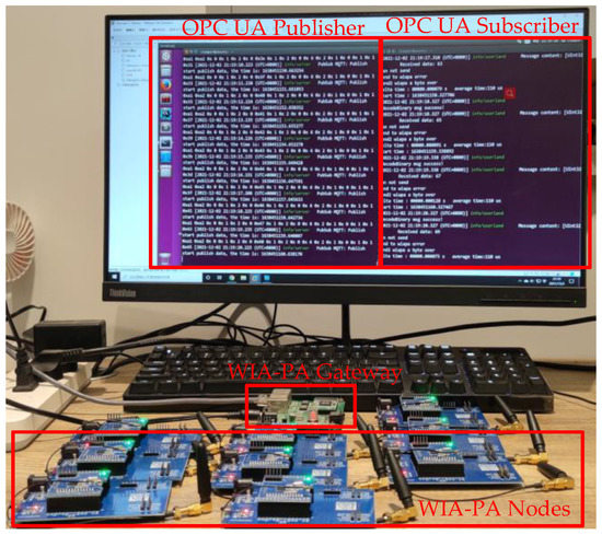 On the basis of the system architecture (Figure 4) and software architecture (Figure 5), a laboratory-level WIA-PA/OPC UA joint pub/sub verification system is constructed, including WIA-PA field devices, a WIA-PA gateway, an OPC UA publisher, an OPC UA subscriber, and an MQTT broker, as shown in Figure 12.