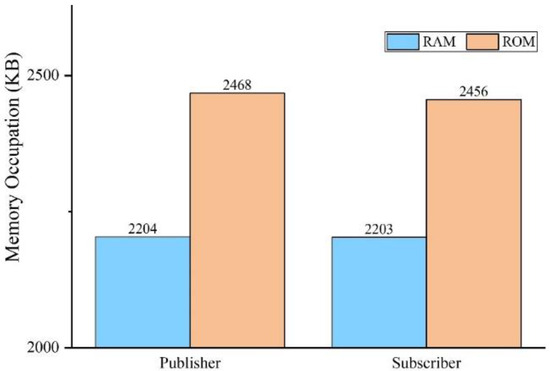 Memory occupancy testing involves the sizes of the read-only memory (ROM) and random-access memory (RAM) consumed by the OPC UA publisher/subscriber application. The test results are shown in Figure 13. The ROM and RAM consumption of both the publisher and subscriber is no more than 2500 KB and can, therefore, meet actual requirements.
