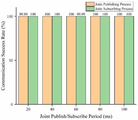 The communication success rate of WIA-PA/OPC UA joint pub/sub in different pub/sub periods (20–100 ms at intervals of 20 ms) is tested. The number of data packets sent by the WIA-PA field device or the MQTT broker is set to 10,000 in each period. In the joint publishing process, the success rate of publishing communication is the ratio of the number of messages received by the MQTT broker to the number of messages sent by the WIA-PA field device. Similarly, in the joint subscription process, the success rate of subscription communication is the ratio of the number of messages received by the WIA-PA field device to the number of messages sent by the MQTT broker. The test results are shown in Figure 14. The communication success rate of the joint pub/sub process is consistently above 99.99%, which fulfills the communication requirements of IWSNs. The test data contain very few failures. The reason for this is that the wireless link encounters interference or blockage, which leads to packet loss during the wireless transmission of WIA-PA.