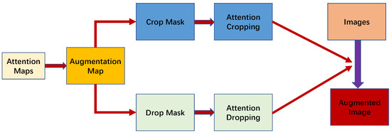 where represents the total number of generated attention maps, as the attention model is composed of multiple overlapping combinations of attention maps. This is proportional to the total number of attention maps for the accuracy of the whole model. According to Hu et al. [27], the accuracy of the whole model stabilizes when the number reaches 32; thus, we set to 32. Then, we used the attention map to obtain the , as shown in Figure 5. Later, we performed attention cropping (sometimes known as interest domain selection) and attention dropping on the obtained attention map by setting a hyperparameter. If the value of a pixel is greater than this hyperparameter, it is changed to 1, and if it is less than this, it is changed to 0. The part that becomes 1 is the area to focus on. After obtaining this region, it is resampled to the original image size and used as an enhanced dataset for training. Attention dropping is used to erase this part from the image and use the rest as the training set to participate in the training of the model [25].