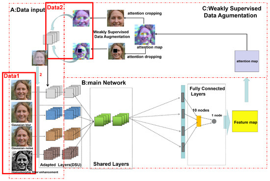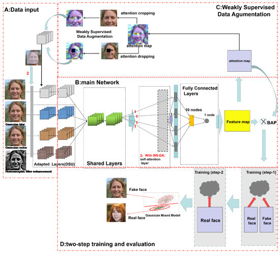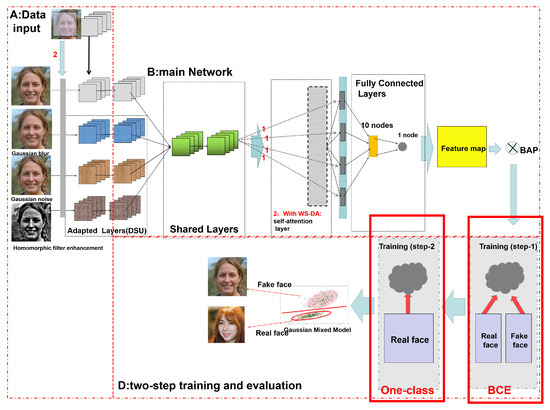 The proposed approach first uses the basic Gaussian blur, Gaussian noise, and homomorphic filter enhancement methods for data augmentation to increase the model’s robustness. In the first round of feature extraction, a WSA mechanism was used to enhance the data by modifying the key regions of the model discriminator. Then, we removed the low-impact information with the help of the obtained attention map. After all the data were obtained, they were used as the input of multiple channels of an MCCNN. A self-attention layer was employed to build the connection between pixels, improving the recognition accuracy. The final discriminative model was generated by employing (a) a Binary Cross-Entropy loss function, (b) one-class classification loss among the fixed features, (c) two loss functions, and (d) the Gaussian mixture model. Then, the final features of the real face was obtained.