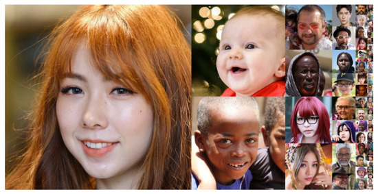 - Karras, T.; Laine, S.; Aila, T. A style-based generator architecture for generative adversarial networks. In Proceedings of the IEEE/CVF Conference on Computer Vision and Pattern Recognition, Long Beach, CA, USA, 15–20 June 2019; pp. 4401–4410. [Google Scholar]