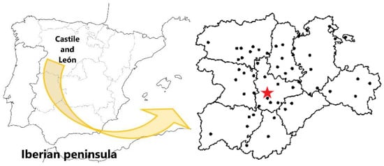 Location of the 54 agrometeorological stations belonging to the Agro-climatic Information System for Irrigation (SIAR) located in Castilla and León Region, Spain [32], highlighting (red star) the site of the agrometeorological station referenced for this study (Tordesillas, Valladolid).