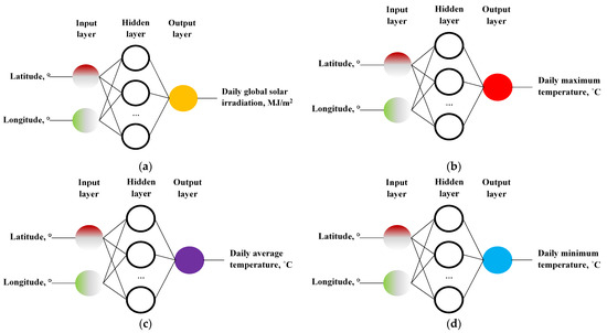 The architectures of the ANNs used for the evaluated geographic interpolation models are illustrated in Figure 2. All of them contain two inputs (longitude and latitude) and one output, which can be the daily global solar irradiation, or the daily mean values of the ambient temperature (maximum, average, or minimum).