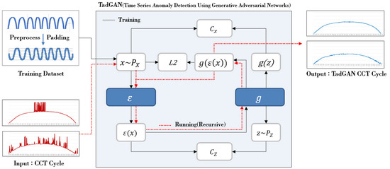 The color temperature of natural light is time series data that varies and is measured every moment. To construct the time series data of an accurate natural light color temperature cycle, color temperatures for 24 h are required. However, since the color temperature can be measured only between sunrise and sunset during the day, it is not easy to construct daily cycle time series data. Therefore, in this study, a padding feature was applied to construct data for learning and processing natural light color temperature so that the day’s color temperature was reconstructed and combined for the duration when natural light was unavailable. In addition, TadGAN (Time Series Anomaly Detection Using Generative Adversarial Networks), which could generate a pattern close to the original for unspecified input values, was applied to generate periodic characteristics for the color temperature values of natural light that changed over time [23,24]. It aimed to generate a daily color temperature cycle by applying TadGAN, which repeatedly applied the generator (, ) for the input sequence of the real-time natural light color temperature, showing an irregular change pattern. Figure 1 shows the flow of generating natural light color temperature cycle by applying TadGAN [23].