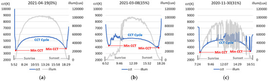 Example of daily color temperature cycle of natural light. (a) ‘21.04.19. (Anomaly ratio: 0%); (b) ‘21.03.08. (Anomaly ratio: 15%); (c) ‘20.11.30. (Anomaly ratio: 31%).