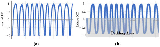Since the training dataset extracted and connected only the color temperature values between sunrise and sunset out of 24 h, the color temperature cycle for each day rapidly changed, as shown in Figure 3a. However, distortion of the color temperature cycle occurred during the training process in the connective section artificially configured to change the color temperature cycle rapidly in the TadGAN model, which used a time series sequence at regular time intervals as input and processing units. Therefore, padding was applied to the connective section of the color temperature cycle. When the padding was applied to express a smooth curve near sunrise and sunset, the color temperature cycle for each date was symmetrically inverted, and the padding of a reverse parabolic pattern connected in front of the original color temperature cycle of the day was applied. The result is shown in Figure 3b.