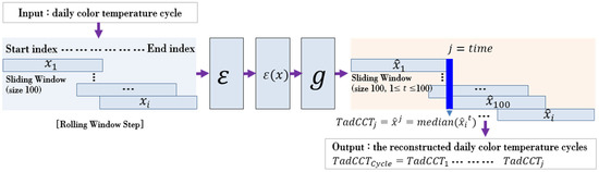Training based on the previously constructed training dataset was executed to establish the TadGAN model in which the color temperature cycle of natural light was generated. After setting the sliding window size to 100 and constructing time series sequence data () at 100 s. intervals, the TadGAN was sequentially applied. The time series data of the color temperature were converted to the sequence (hereinafter expressed as , where ‘’ was the time series sequence number) having a specific size ( = 100), and then a reconstructed sequence having the same size through the processing of was created. Therefore, a total of 100 reconstructed sequences were sequentially generated per hour. The median value for the (where ) values at a time () were taken and was calculated. Figure 4 presents the natural light color temperature generation using TadGAN.
