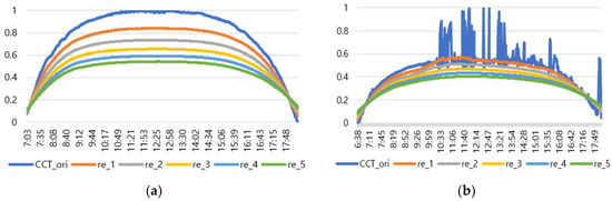 After that, by applying the TadGAN until time corresponded to the end of the color temperature cycle, a reconstructed color temperature cycle () was generated. The color temperature cycle generated through TadGAN showed a softer parabolic shape than the pattern of the original color temperature and produced a lower color temperature cycle than the original. Therefore, a color temperature cycle similar to the original could be generated if the heights of the color temperature cycle were adjusted for each section after removing the irregular color temperature pattern through the recursive application of TadGAN. Figure 5 shows the results of applying TadGAN recursively on clear days and cloudy days, respectively, and the results of recursively executing TadGAN till the fifth round are presented.