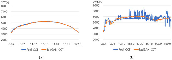 An experiment was conducted to check the possibility of generating a color temperature cycle through the proposed method to input the actual natural light color temperature. For the experiment, a sunny day with an anomaly ratio of less than 5% and a cloudy day with an anomaly ratio of about 30% were selected. Figure 6 shows the results of applying the proposed method.