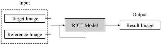 Colorists are classified as having a technical post because it is not easy to design a set of natural and harmonious color combinations and apply them properly to an image. The purpose of the RICT model is to extract the attribute features of the reference image and apply it to the target image with semantically related content. Before constructing the model, the following two problems need to be solved: First, calculate the semantic correlation between the two images. This paper uses the gray-VGG19 [27] to extract the detailed features of the images and perform feature matching. Second, transfer colors based on similarity rules. The RICT network architecture is shown in Figure 2, the input is the target image and the reference image . Next, the network uses the pre-trained VGG19 to extract the depth feature maps of the two images, and calculates the semantic similarity between the two to obtain the two-way mapping function . Finally, this information is used to propagate the correct colors to color blocks or pixels with the same semantics.