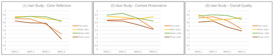 To further verify the superiority of our algorithm, we also invited 20 people to score the eight groups of images in Figure 9 according to three indicators: naturalness, emotional expressiveness, and fidelity. As shown in Figure 10, for images with explicit emotions such as the first four images, adding emotion labels or not has little effect on the results. For the fifth and sixth images whose emotions are not easily discernable, the addition of emotion labels still has some effect on the results, so the scores on the three indicators are also unstable, but the overall scores on the three indicators are still slightly higher than those of the model without emotion labels. For the latter two images which feature easy-to-distinguish emotions, adding emotion labels has a great impact on the results, so the scores on the three indicators are generally high. In general, the advantages of adding emotional labels to the model’s color transfer process outweigh the disadvantages.