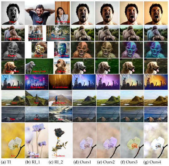 For example, the second image “dog” in Figure 9 also uses brown-based color conversion. Having only the result after adding the emotion label not only ensures that the foreground “dog hair color” is consistent with the reference image, but it also allows the unity of the background color with the reference image, and ensures that the overall look is more natural and the palette is similar to the reference image. For example, the fifth image “concert” and the sixth image “mountains” in Figure 9 showed stronger colors after adding emotional labels, and the resulting images showed inconsistent emotions. As another example, in the last two images in Figure 9, whether to add the emotion label or not has little effect on the color of the resulting image, but its emotion has obviously changed a lot. In the seventh image, when the reference image is labeled with fear, the emotion of the corresponding resulting image is also fear. The resulting image is no longer as fearful as the emotion of the original image, but a little more warm. In the eighth image, when the reference image is a black rose, the emotion of the resulting image generated after labeling the emotion is significantly closer to the emotional color of the reference image. In general, the color of the target image combined with the emotional label of the reference image has little influence on the overall color of the resulting image, but it can maintain the color consistency with the reference image at the critical moment.
