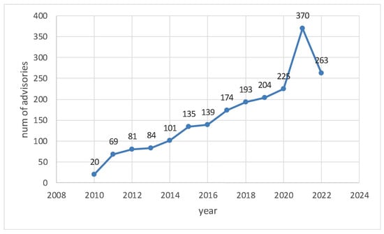 State explosion is the origin of all the challenges in the regular expression matching field, and the increasing number and complexity of attack features continue to exacerbate this challenge. We counted the ICS-CERT advisories from the Cybersecurity and Infrastructure Security Agency (CISA). These advisories provide timely information about current security issues, vulnerabilities, and exploits. The results show that advisories are growing rapidly, from 20 in 2010 to 370 in 2021, as shown in Figure 1.