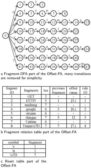 Offset-FA for the rule set GET[ˆ∖r∖n]*HTTP/, mailmsg.*google, stream.{5}ifenguc, and Uptime[ˆ∖x7D]*Trojan∖x7D.