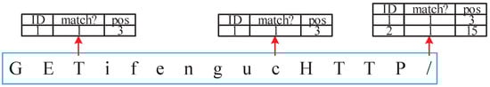 For input GETifengucHTTP/, the matching engine creates an empty MPT and starts from the beginning of the input. After reading GET, State 3 is active in fragment-DFA, and fragment “GET” is matched. Then, the matching engine needs to inquire the fragment relation table to obtain the information of the fragment “GET”. As no previous fragment is required before “GET”, the matching of “GET” is confirmed, and the matching information is updated to the MPT. Then, for the following ifenguc, State 34 is active, and fragment “ifenguc” is matched. However, from FRT, we know that fragment “ifenguc” relies on the matching of its previous fragment “stream”. As fragment “stream” has not yet appeared in the matching process table, the matching of fragment “ifenguc” is a false positive and is not updated to the MPT. After reading the remaining sequence, HTTP/, State 8 is active, and we need to inquire about information on Fragment 2. According to FRT, Fragment 2 relies on Fragment 1. As Fragment 1 was recorded in the MPT, we needed to further check whether the offset requirement was fulfilled. The matched positions of Fragments 1 and 2 were 3 and 15, respectively, and their position offset was 12. This fulfils the offset range [5); thus, the matching of Fragment 2 is valid, and its corresponding rule ID 1 is reported. Figure 3 shows how the MPT is updated during matching.