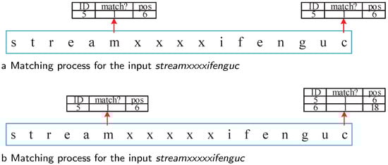 Similarly, for input sequence streamxxxxifenguc, Fragment 5 is marked as matched at Position 6 after the processing stream. When the last character is processed, State 34 is active, and Fragment 6 is matched at Position 17. From the FRT, we know that Fragment 6 relied on Fragment 5, but their position offset was 11, not equal to the offset requirement 12. Thus, the matching of Fragment 6 is a false positive. For input streamxxxxxifenguc, Fragments 5 and 6 are matched at Positions 6 and 18, respectively. Their position offset was equal to the offset range 12; thus, Fragment 6 was matched, and its corresponding rule ID 3 was reported. The matching processes for these two sequences are shown in Figure 4.