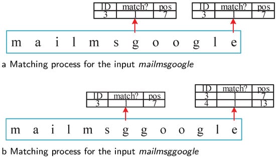 Next, we used several input sequences to explain how Offset-FA works for matching. For each input sequence, the matching engine maintains a matching process table (MPT) to record the current matching status, recording the fragments and the matched positions that were matched. The MPT is checked and updated during the matching process.