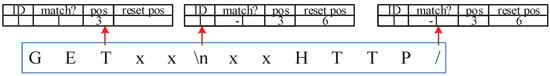 For input GETxx∖nxxHTTP/, Fragment 1 is matched at Position 3, and this matching status is updated to the MPT. Then, the MPT has no change until the matching engine reads character ∖n at Position 6. The reset table shows that character ∖n would cause the reset operation for Fragment 1. Thus, the matching information of Fragment 1 is reset in MPT, as shown in Figure 6. Here, −1 denotes that the fragment was matched before but reset later. The reset position value is also updated to the MPT and is used to avoid false positives and false negatives. When the last character was processed in fragment-DFA, State 8 was active. Then, we needed to check the corresponding requirements for Fragment 2. Its previous fragment was reset at Position 6. From the matched position (13) and length (5) of Fragment 2, we know that the reset position was actually before Fragment 2. This means that the reset operation was valid, and the matching of Fragment 2 was a false positive and not recorded.