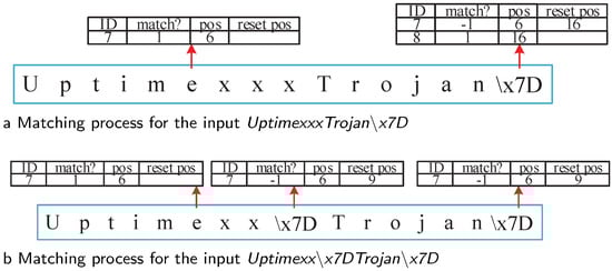 The situation becomes more complex if the excluded character appears in the following fragment in the RE pattern [44]. For example, in pattern “Uptime[ˆ∖x7D]*Trojan∖x7D”, excluded character ‘∖x7D’ appears in fragment ‘Trojan∖x7D’. The matching engine must be able to distinguish between different reset situations. For input UptimexxxTrojan∖x7D, Fragment 7 is first matched at Position 6. Then, after processing xxxTrojan∖x7D, State 47 was active in Fragment-DFA. For the last character, ∖x7D, the engine reset the corresponding Fragment 7, and the reset position was set as 16. Then, for matched Fragment 8, the engine checked that Fragment 7 is reset at Position 16. According to the matched position (16) and length (7) of Fragment 8, the reset position was inside Fragment 8, which means that the reset was caused by the matching of Fragment 8. Thus, this reset is an invalid operation, and the matched information of Fragment 8 was updated to the MPT. Further, corresponding rule ID 4 was reported. The matching process is illustrated in Figure 7a.