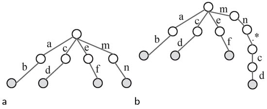 Trie tree construction process when inserting pattern “mn.*cd.*gh”. (a) After inserting fragment “mn”; (b) after inserting fragment “cd”.