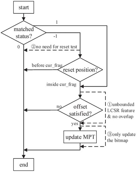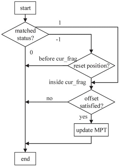 There exist three matching statuses (1,−1,0) for the previous fragment in the MPT. Figure 9 clarifies the specific procedures for these cases. If the matching status is 1, the engine only needs to check whether the offset of their matched position satisfies the corresponding offset range. If it is met, the matching of the current fragment is confirmed and updated to the MPT (Steps 26 to 30). Otherwise, the matching of the current fragment is invalid, and the MPT remains unchanged.
