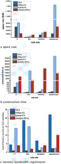 On the other hand, the hybrid FA and Offset-FA had a huge time cost for the compilation procedure. Their time cost was about 1 to 3 orders higher than that of NFA, and the hybrid FA cost more than 12 h for the spyware-put set. In general, the time cost of the hybrid FA was linear with the number of head-DFA states. In the Bro set, the NFA reduction procedure also greatly contributed to the compilation time in hybrid-FA, especially when the rule set contained some large bounded LCSR features. The state number of multiple DFAs is not so large as that of the hybrid FA, but it still costs hours to compile these rule sets. The leading cause is that it needs to compute the relationship between every two rules and try many grouping combinations.