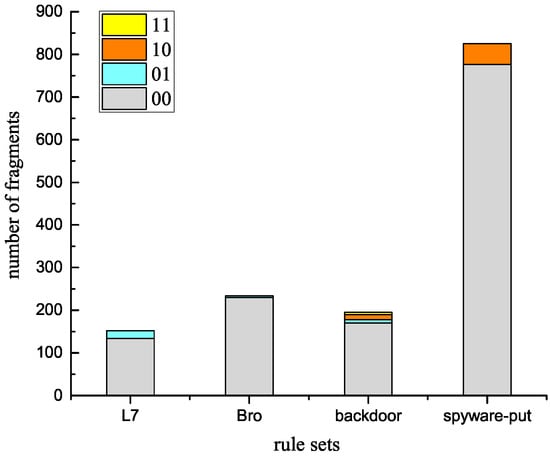 On the other hand, optimizations in Section 4 and Section 5 also greatly contributed to reducing the number of memory accesses when fragments are matched.Figure 13 provides the number of each kind of fragment in these rule sets according to their values. Fragments with a value of 00 occupied the vast majority (from 87% to 98%) in each rule set. This means that, when these fragments were matched in Fragment-DFA, there was no need to check the match/reset position items of their previous fragments (corresponding to Optimizations ① and ②). The matching engine only consumed one memory access to obtain the ID of the previous fragment, then checks the matching status of the previous fragment from the bitmap to confirm the matching of the current fragment. Further, for fragments with a value of 00, as the confirmation of these matching does not rely on the match/reset positions of their previous fragment, the matching engine would not record the match/reset position items for their previous fragments. Accordingly, their previous fragments would not involve any update operations on the match/reset position field, and the matching engine only needed to update the bitmap part for them (corresponding to Optimization ③).