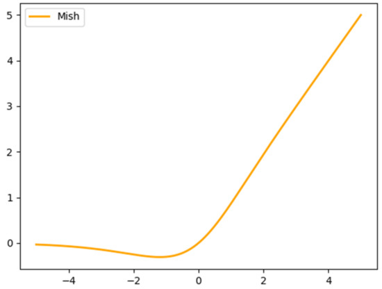 Unlike DarkNet53, the Mish activation function is utilized in CSPDarkNet53. Mish is a smooth and non-monotonic activation function [23]. The expression is defined in Equation (1) and the corresponding function graph is also presented in Figure 2.