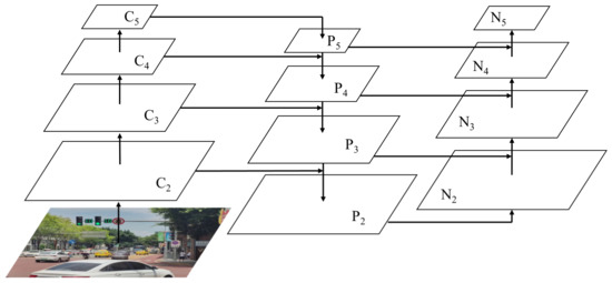 The PANet network is a feature fusion network based on Feature Pyramid Network (FPN) [25]. Large target features are obtained by constructing the up-sampling feature pyramid of deep features. Meanwhile, a down-sampling feature pyramid of shallow features is added to get small target features and improve a fusion effect of deep features and shallow features. The network structure of PANet is indicated in Figure 3.