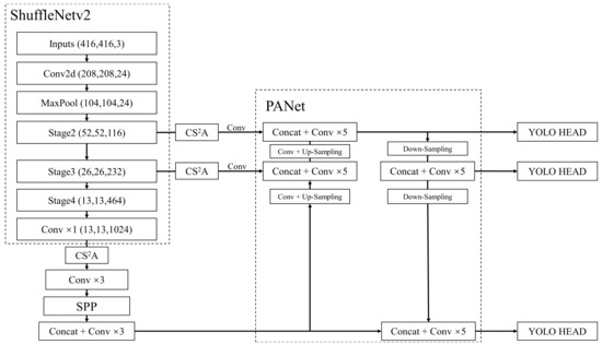 The lightweight ShuffleNetv2 network is regarded as a backbone network in the framework of YOLOv4. The ShuffleNetv2 network, which was proposed by improving the ShuffleNetv1 network [26] with a large amount of experimental data, is a lightweight neural network designed for mobile terminals.