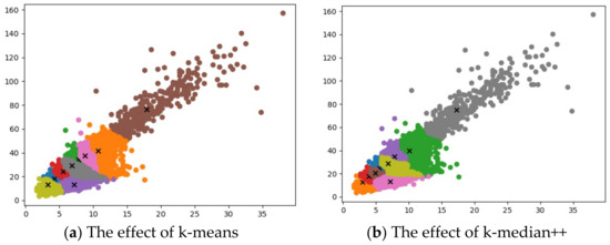 For the sensitivity issue of initial clustering centers, an initial clustering center c is randomly chosen. The distance D among each sample point xi and the existing initial clustering centers can be calculated to acquire the probability P that the sample point can be regarded as the next initial cluster center, as expressed in Equation (13).