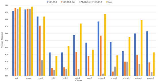 The accuracy comparison of each class can be acquired and shown in Figure 10. It can be seen that compared with YOLOv4, YOLOv4-tiny and MobileNetv3-YOLOv4, the AP of traffic light colors recognition increases by 4.5%, 2% and 2.5%, respectively, and the AP of traffic light digitals recognition increases by 1.1%, 26.1% and 44%, respectively, with the adoption of proposed algorithm. It can be seen that the proposed algorithm has high accuracy in recognizing the state of traffic lights and satisfies the requirements of being lightweight.