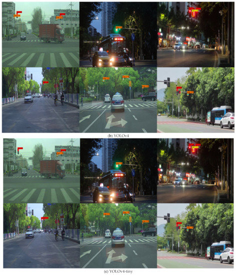 The results indicate that the proposed algorithm is superior to YOLOv4 and the similar lightweight algorithms YOLOv4-tiny and MobileNetv3-YOLOv4 in the detection and recognition of traffic lights’ state information, having a lower miss ratio and better fitting ability. Compared with YOLOv4-tiny, the model size is augmented but the detection effect is significantly improved, which is more advantageous in practical applications.