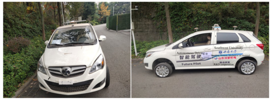 To verify the effectiveness and reliability of the proposed algorithm in practical application, an appropriate scene is selected for a real-vehicle test. The test operating system is Ubuntu 18.04, the GPU is NVIDA GeForce RTX 3090 24G, and the CPU is Intel i9-11900K 3.5 GHz. The test environment is CUDA 11.2, cuDNN 8.4.0, Python 3.8. The deep learning framework is Pytorch 1.7.0. The test platform is indicated in Figure 12.