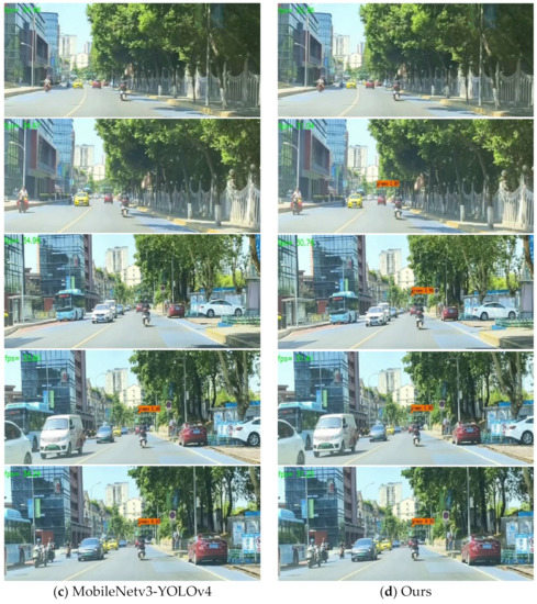 To ensure the application of the proposed algorithm in actual autonomous driving scenarios, it is essential to analyze the complexity of the model. YOLOv4 and the lightweight networks YOLOv4-tiny and MobileNetv3-YOLOv4 are selected for comparison.