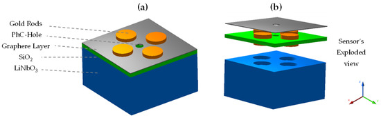 The graphene layer is segregated from the substrate using a 20 nm thick SiO2 layer, compulsory for the adherence of contrast materials with each other [31]. The graphene layer is critical for the overall sensor design as it forms a thin and highly conductive surface over the two dielectric layers. Graphene is well-known for its efficiency to detect RI variation over its surface, hence enhancing the overall sensitivity of the sensor. Its thickness was kept at 0.34 nm for an optimum sensor design [32,33]. The four Au nanorods were placed from the top layer down to the LiNbO3 foundation layer for creating stronger plasmonic pulses across all adjacent layers. The dimensions of the Au nanorods were chosen to be 50 nm in radius and 60 nm in height. For better EM penetration and the containment of photons within the sub-layers, a nanohole with a 20 nm radius was carved at the center to form a PhC structure. All the geometrical parameters of the sensor model were optimized in the numerical simulations for a range of best-fitting values to enable proper tuning and impedance matching. The simulation model with its exploded view is shown in Figure 1a,b. All of the parametric measurement values of the model design are listed in Table 1.