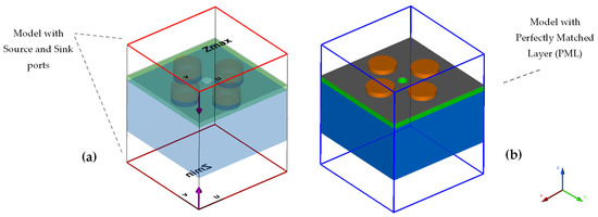 The numerical modeling of the sensor was carried out in CST Studio based on the finite element method (FEM) and the tetrahedral meshing technique was used for the calculations. To reduce the simulation time phenomenally in the dense mesh frequency domain technique (which has a higher accuracy over time domain in nanoscale models), the unit cell model technique was used. To terminate the simulation domain, Floquet periodic boundary conditions (PBC) were used in the x- and y-directions and open boundaries were used in the z-direction. Additionally, the perfectly matched layer (PML) condition was used to absorb the unwanted EM field and suppress any higher-order energy modes generated by the periodic structure. Within the boundary of PML, two Floquet-ports named Zmax and Zmin were introduced in the z-direction above and below the structure with the background spacing of 100 nm each, so that they could act as a source and sink for the calculation of the reflection and transmission spectra of EM energy in the form of S-parameters. The port setup and PML boundary are indicated in Figure 2a,b.