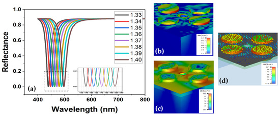 The simulation was performed for each step variation in RI and the value of S was calculated as per Equation (4). In the output spectra illustrated in Figure 4a, it can be observed that a red-shift occurred in the response wavelength of the reflectance (as well as in absorbance) of the sensor. Since the design was optimized to be a perfect absorber, the transmittance is ideally non-existent, and therefore the output response value reached close to unity. Considering the reflectance spectra, the highest shift in the response wavelength was noted as 9.81 nm from 487.45 nm to 497.26 nm for a change in RI from 1.39 to 1.40, which corresponded to a sensitivity value of 981 nm/RIU. The minimum shift in the response wavelength was observed as 7.95 nm from 439.27 nm to 447.22 nm for a RI variation between 1.33 and 1.34.