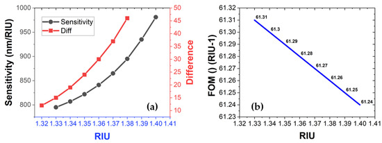 (a) Sensitivity vs. RIU for the biological RI range of 1.33 to 1.44. Redline showing the step size of wavelength shift for the tested RI range. (b) FOM vs. RIU for the RI range of 1.33 to 1.40.