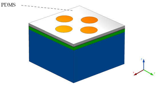 To test the performance of the device as a temperature sensor, the design was slightly modified by the addition of a PDMS polymer layer over the top of the graphene layer up to the level of the Au nanorods as shown in Figure 6. The PDMS material is known for its incompressible and high sensitivity nature to temperature variation. It acts as a transparent material for a wide electromagnetic spectrum except for the infrared range (heat energy). PDMS belongs to the family of siloxane polymers and possesses qualities such as excellent elastic and thermos-optic coefficients with little absorption loss [36]. Therefore, it has been proposed for a variety of biomedical, chemical, and thermal sensing applications. For the sake of simplicity and better control in the proposed device, the PDMS layer was deposited over the top surface rather than inside the design.
