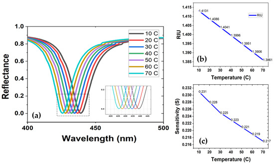 (a) Spectral response of the sensor for variation in the ambient temperature, showing a blueshift. (b) Temperature vs. RIU. (c) Temperature vs. sensitivity.