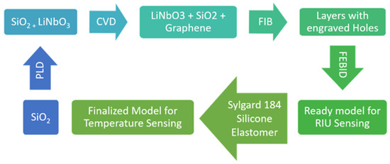 The fabrication process of the proposed sensor mainly involves the deposition of thin films, lithography, and etching of the PhC cavity. In the first step, a thin layer of SiO2 can be deposited to form the substrate using conventual deposition techniques such as plasma enhanced chemical vapor deposition (PECVD) or ion-beam sputter deposition (IBSD) [44]. In the second step, a LiNbO3 layer can be deposited using pulse laser deposition (PLD), which is a modified form of pulse vapor deposition (PVD), giving better accuracy and control over the conventional deposition techniques. In this technique, a high-power pulsed laser beam is focused on a target of the desired material that causes vaporization to deposit a thin film [45]. The twin-layered structure is then inverted and by using the well-known chemical vapor deposition (CVD) method, the thin film of the graphene is added over the SiO2 layer. The holes can then be carved using focused ion-beam (FIB) technology with the metal etch-mask technique [46]. As a final stage, focused electron-ion beam induced deposition (FEBID) can be utilized for shaping Au rods over the structure. This last step contributes toward metal deposition and milling to achieve the required shape with the desired characteristics [47]. For the case of temperature sensing, the PDMS layer can be deposited through the direct deposition of sylgard 184 silicon elastomer with heat curing for the proper setting of material. The step-by-step fabrication process is shown in Figure 8. The work conducted in [48] presents the fabrication of a sensor model closely related to the proposed model in this work by using soft nano-imprint lithography. The process involves generating a PDMS stamp through the deposition of silicon on a chromium slab and later using sol–gel resist to form a solid silica model. The PDMS stamp is then used to produce an array of vertical Au nanorods. The structure in the process is annealed multiple times for the settling of the materials. However, the PDMS stamp poses the vulnerability of traced air that deshapes the cylinders and often reduces the heights of the majority of them [49]. Therefore, the PDMS functional layer is proposed to be deposited on top of the sensor at the final stages.