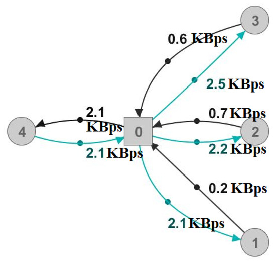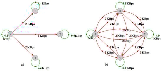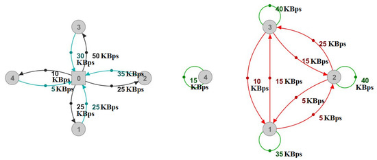 Due to the complex nature of describing connections between physical equipment and logical relations between the players within the gaming server’s application that cause bandwidth usage, we introduce the multiplayer-relations graph, which facilitates the modeling of our attack. The multiplayer-relations graph is the server’s view of clients (vertices) and their interrelationships, quantified by weighted, directed edges, representing bandwidth usage. Loops in this graph describe clients’ bandwidth usage for individual needs, both upload and download, as these are API calls sent to the server and results of API calls that affect the caller. We have used loops to describe actions such as playing alone in an isolated area, obtaining responses from the server, keeping the connection alive, and sending API calls with their respective arguments (e.g., chat API and message content). A directed edge quantifies bandwidth usage (server’s upload, which is the client’s download) resulting from API calls by one vertex, affecting the targeted vertex, such as a private message from one player to another. Physically, clients are in a star topology with the server in the center. However, we must point out that the multiplayer-relations graph provides much more information. This graph is based on users’ actions affecting the server application. Due to the physical graph’s lack of information, generating a multiplayer-relations graph requires information from the server application. Assuming that we have the information about source and destination of traffic between the clients, the transition from a physical to a multiplayer-relations graph is shown in Figure 3, which illustrates insufficient insight from only observing from a networking perspective. The transform procedure from the physical graph to the multiplayer-relations graph is the following: