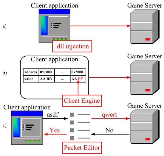Exploitation of the client application by (a) modifying game files, (b) modifying memory during runtime, and (c) modifying network packets.