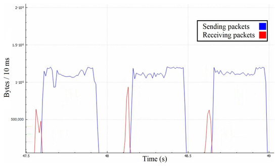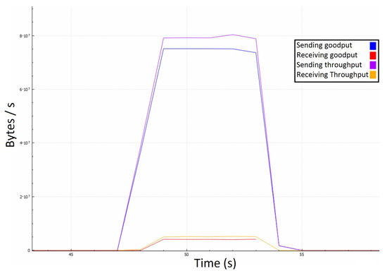 In Figure 8, we can precisely observe that the attacking messages are causing the server to retransmit them to each of the attackers individually. This process takes time because the server requires a certain amount of bandwidth because the 1Gbps link is limited at a 1.25 MB/10 ms rate. In terms of bandwidth, the surface of the red curve should be around 20 times lesser than the surface of the blue one, which might not be intuitive, so we illustrated it in Figure 9 among the throughputs to roughly estimate the impact of other protocols.
