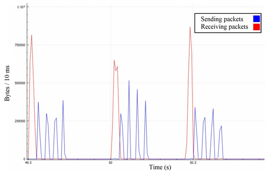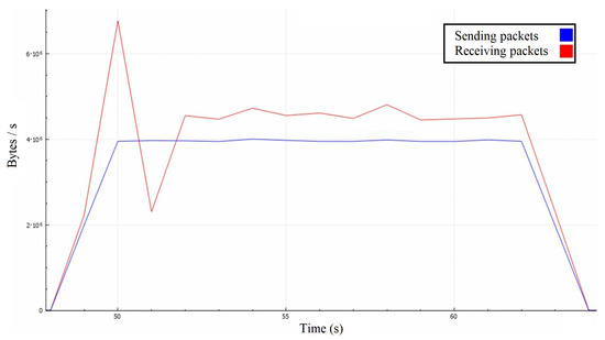 Similarly to the first attack scenario, the attackers’ combined messages cause retransmission in several lengthy packets containing many add-on messages, rather than the expected one-by-one retransmission mechanism (Figure 10). Since this is a volumetric attack, the surface below the receiving and corresponding sending traffic curves should be roughly the same. Averaged over a second (Figure 11), the graph shows that the attacker’s traffic is around 4.5 MBps.