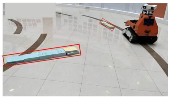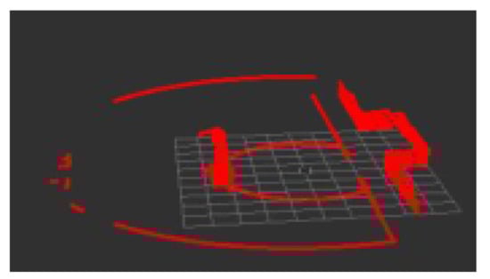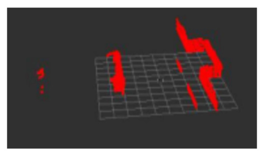In the actual complex scene, compared with the two-dimensional laser radar, the robot designed by us was equipped with a multiline laser radar, which can well identify and avoid obstacles on the ground and met the detection requirements. The obstacles in the red area are shown in Figure 12.