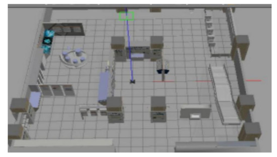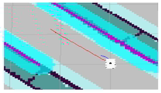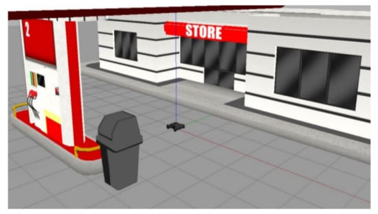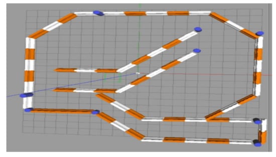 To evaluate the navigation system better and more comprehensively, we verified it on a simulation platform and in a real experiment. The simulation tool uses the gazebo simulation platform [16] of ROS to build different types of warehouse simulation. Figure 5, Figure 6 and Figure 7 show the indoor environment of the office, and the outdoor environments of the gas station and the narrow road in that order. The map built in the simulated narrow environment is shown in Figure 8, the actual navigation map is shown in Figure 9, and the path planning map is shown in Figure 10. The red line is the global planning route, and the blue line is the global planning route. The simulation used a turtlebot3 robot, and the laser lidar was a multiline lidar. The computer CPU had an Intel (R) core (TM), i5-10210u CPU @ 1.60 GHZ, Ubuntu version 18.04, and ROS version melodic.