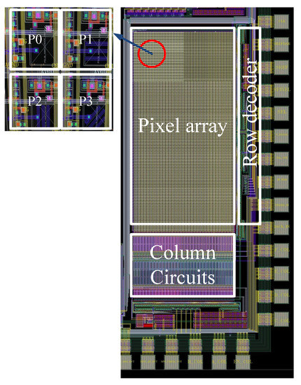 The custom-designed camera used a CMOS image sensor with an on-chip polarizer. The CMOS image sensor was fabricated in an AMS 350-nm OPTO process. The microchip photograph of the CMOS image sensor with an in-pixel polarizer is shown in Figure 3. The on-chip polarizer was created using the metal 1 interconnect on the pixel [29,30]. The pitch of the wire grid polarizer was 700 nm. The pitch of the wire grid was limited by the technology rules of the fabrication house. The spatial resolution of the pixel array was 64 × 128. The pixels were arranged in a 2 × 2 matrix as P0, P1, P2, and P3. Pixel P0 measured the intensity of the incident light. Pixel P1 had a metal grid polarizer oriented with a transmission axis of 0, P2 had a polarizer with a transmission axis of 45, and P3 had a polarizer with a transmission axis of 90. The 2 × 2 pixel array structures with in-pixel polarizers were repeated across the entire imaging array. The pixels with a polarizer of the defined transmission axis allowed the selective transmission of the reflected light whose phase was the same as that of the transmission axis. Therefore, as the phase of the incoming light changed, the received intensity on the pixel with a wire grid followed Malus law. The transmission axis of the external polarizer in front of the light could be manually changed at a step resolution of 1. Pixel P0 measured the reflected unpolarized light, while P1, P2, and P3 measured the intensities , , and , respectively. The measured intensity was an average of 100 images captured to remove any temporal noise in the measurement set-up.
